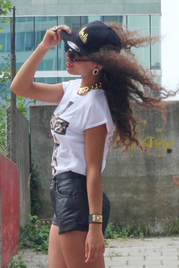 Here, I chose to wear the snapback with a white crossed tiger top & leather shorts that I found in a vintage