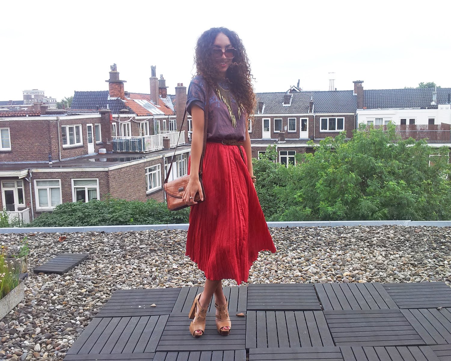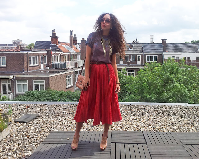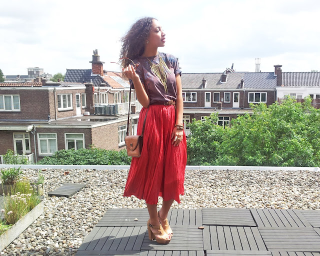 Wearing: Gift skirt, Boyfriend’s t-shirt, Asos heels, Seven45 necklace, Noordermarkt bracelet, H&M/Topshop/Gift rings,